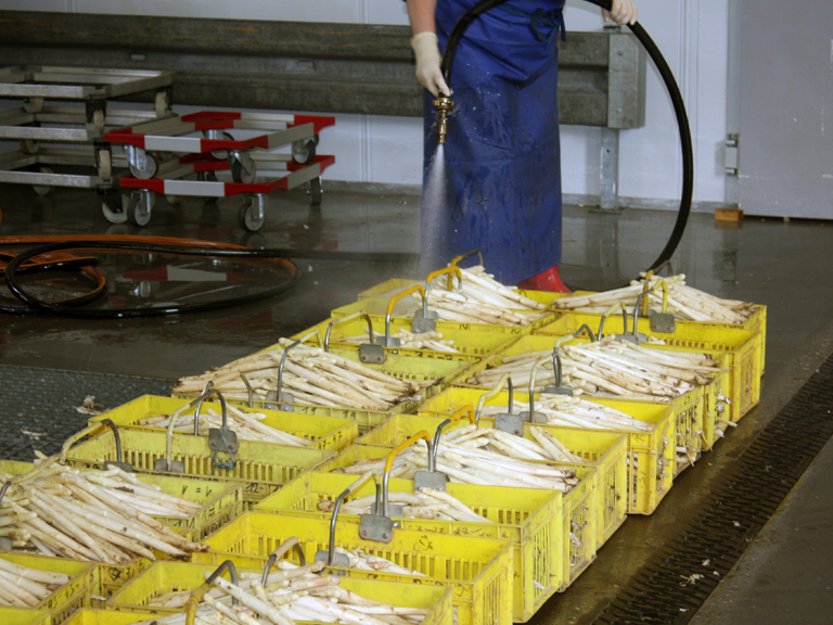 Direkt nach der Ernte vom Feld kommt der Spargel in den Sortierraum, wird gewaschen, geschnitten und auf die entsprechenden Qualitätsklassen sortiert.
