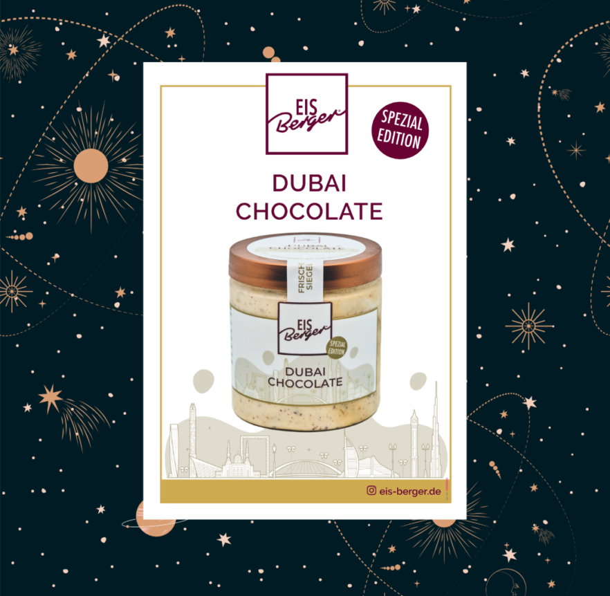 Bekannt wurde das Produkt durch die Dubai-Schokolade und ist im Ursprung eine gefüllte Tafelschokolade mit Kadaifi und Pistazien. Sie erlebte 2024 einen Hype in den deutschsprachigen sozialen Medien. Als Entwickler gilt die Schokoladen-Manufaktur „Fix Dessert Chocolatier“ im Emirat Dubai; dort unter dem Marken-Namen „Can't Get Knafeh of It“ - ab sofort steht sie in unserem Eisschrank, das müssen Sie probieren oder als Geschenkidee nutzen.