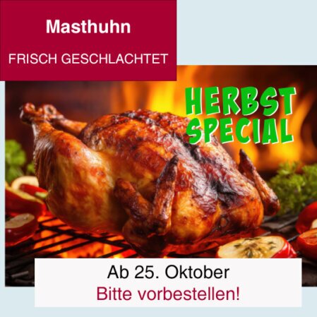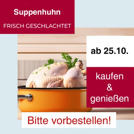 Und als besonderes Herbsthighlight kommt am 25. Oktober das Schlachtmobil mit frisch geschlachteten Masthähnchen und Suppenhühnern. Auf Grund der hohen Nachfrage bitten wir um Vorbestellung. Schreiben Sie uns einfach eine Email oder rufen Sie uns an.