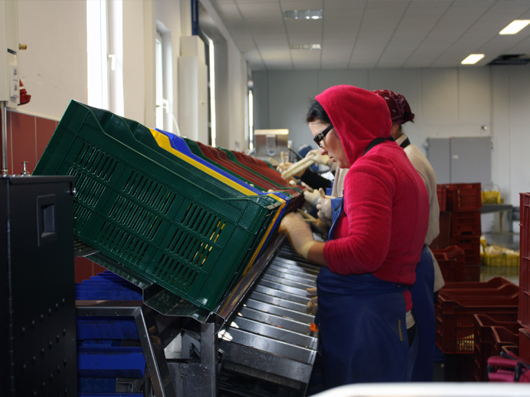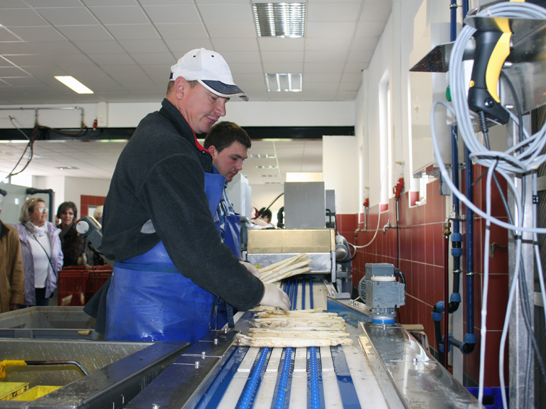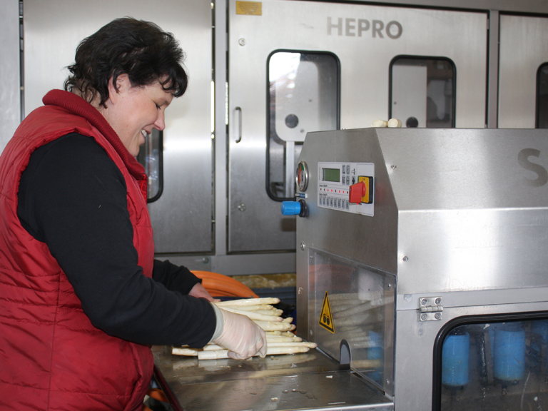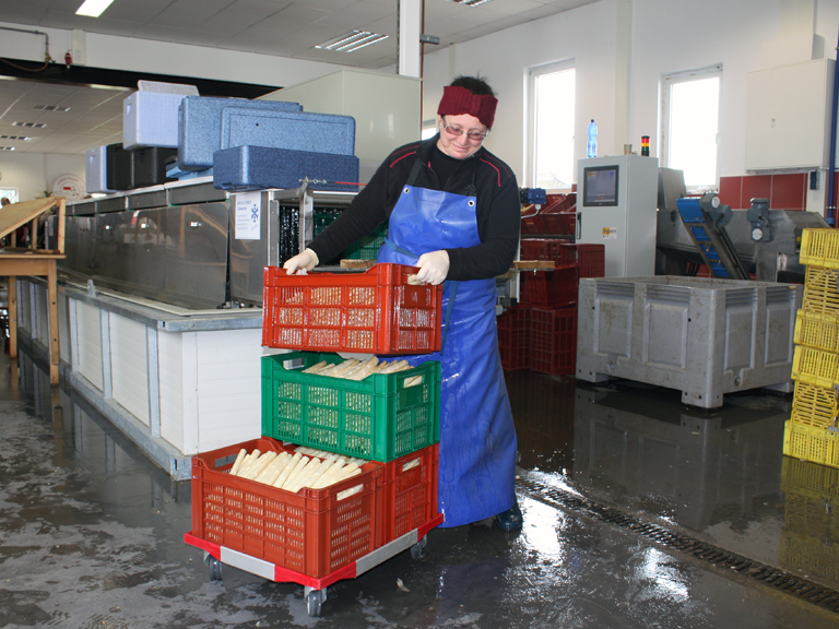 Direkt nach der Ernte vom Feld kommt der Spargel in den Sortierraum, wird gewaschen, geschnitten und auf die entsprechenden Qualitätsklassen sortiert.